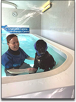 Before each and every swim the dog is given a health check and assessed as to its suitability to swim on that day. All dogs wear a buoyancy aid and a hydrotherapist will get in with the dog if needed. Swim jets can be used for the dog to swim against to provide extra resistance if necessary. The length of the session will depend on the dogs condition, needs and ability.